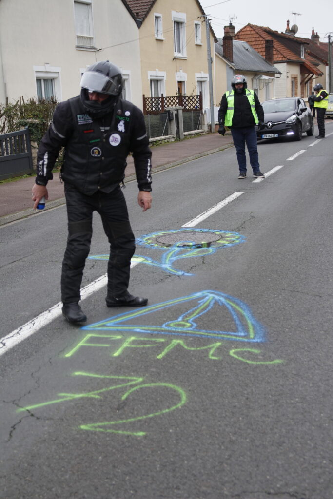 Dès le matin, cinq militants motivés de l’antenne sarthoise se sont réunis à La Ferté-Bernard. Armés de bombes de peinture de chantier (temporaires) et d’appareils photo, ils ont sillonné les routes du département pendant plus de 4 heures pour certains d’entre nous, couvrant un itinéraire d’une centaine km passant par Mamers pour revenir au Mans.